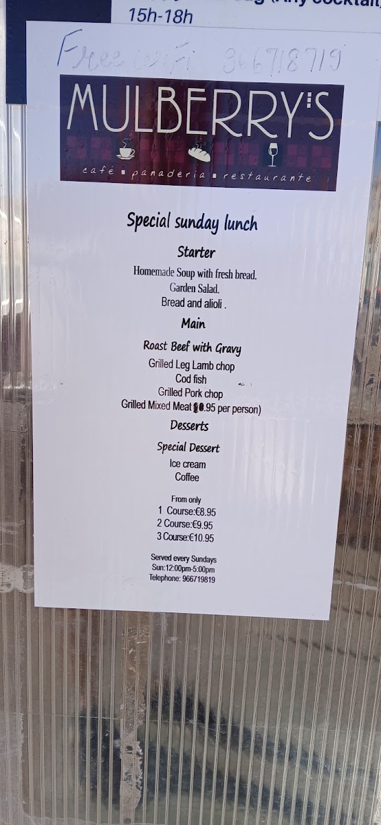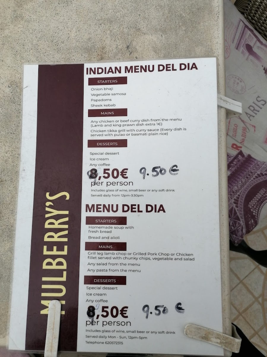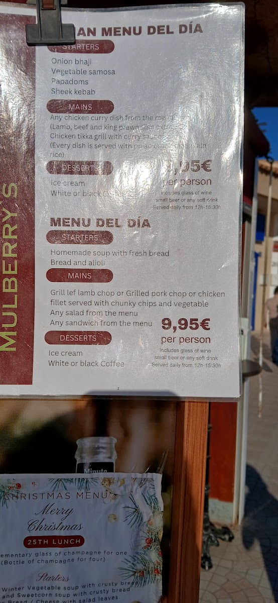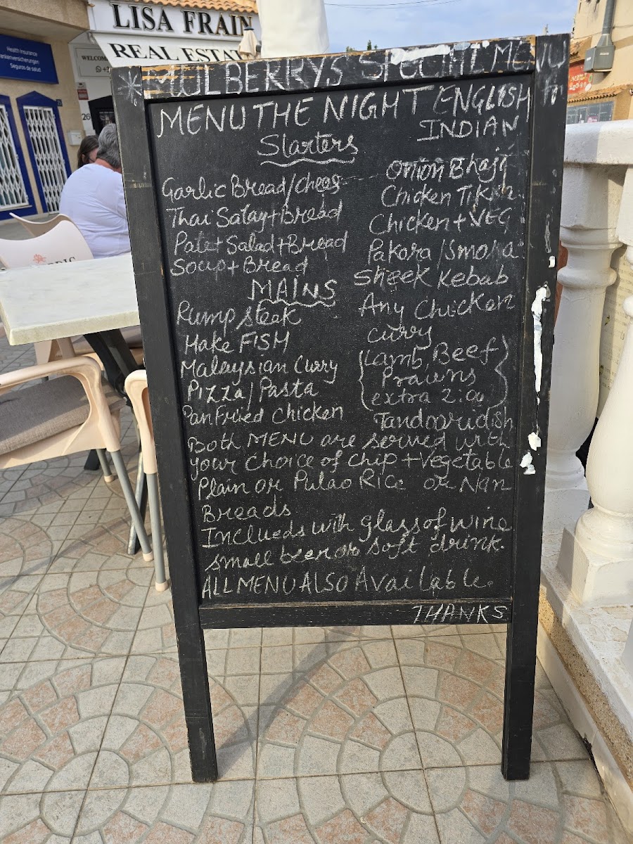 As a reviewer, my overall impression of the menu at Mulberry's Ciudad Quesada, located at C. los Arcos, 23, is that it confidently brings together Indian, Mediterranean, fast-food, and international comfort dishes into one cohesive offering, making it ideal for groups with varied tastes. The Especialidades Tandoor section sets the tone with aromatic classics such as Cordero Tikka Saslic, Langostinos Tandoori, Pollo Tikka, Pollo Tandoori, and Pescado Tikka Ajwain, while the Nuestros Chefs Recomiendan highlights richer curries like Pollo Goan Al Curry, Langostinos Goan Al Curry, and Pollo Con Mantequilla. For casual dining, the Kebabs Menús-including Kebab De Ternera Rollo, Kebab De Ternera Pitta, Kebab Box Con Patatas Fritas (Grande), Kebab De Pollo Rollo, and Kebab Mixto Rollo-sit perfectly alongside hearty Burgers Menús such as Hamburguesa Con Bacon, Hamburguesa De Pescado, and Hamburguesa De Pollo. The menu also caters well to sharing and snacking with Palitos De Pescado (6 Pzs.), Patatas Fritas (Pequeña), Palitos De Mozzarella (10 Pzs.), Pan De Ajo (Mediano), and Pan De Ajo (Familiar). Vegetarian diners are well looked after thanks to Pakoras Vegetarianas, Bhaji De Cebolla, Samosas Vegetarianas, and vegetable mains like Chana Masala, Bombay Aloo, Aloo Gobi, and Saag Paneer, complemented by Arroz Basmati, Arroz Pulao, and Arroz Pulao Con Champiñón. Lighter options such as Ensalada Mixta Vegetariana, Ensalada Especial, Ensalada De Gambas, Ensalada De Atún, and Ensalada Mexicana balance out indulgent choices like Pizza Marinera, Pizza Kebab Pollo, Pizza Capricciosa, Pizza Special Tandoori Con Pollo Tikka, and Pizza BBQ Chicken, as well as Lasaña, Pasta Carbonara, and Pasta Boloñesa. Traditional accompaniments-Naan Con Queso, Plain Naan, Parantha, Naan Con Cebolla, Naan Keema, and Papadom (2 Pzs.)-round out the experience, with drinks ranging from Cerveza Monster (Grande) and Cidra Kopparberg (Grande) to Fanta Naranja (2 Lt.), Coca-Cola Sabor Original Lata 330ml., and Agua (Grande), making the menu feel complete, generous, and thoughtfully curated.